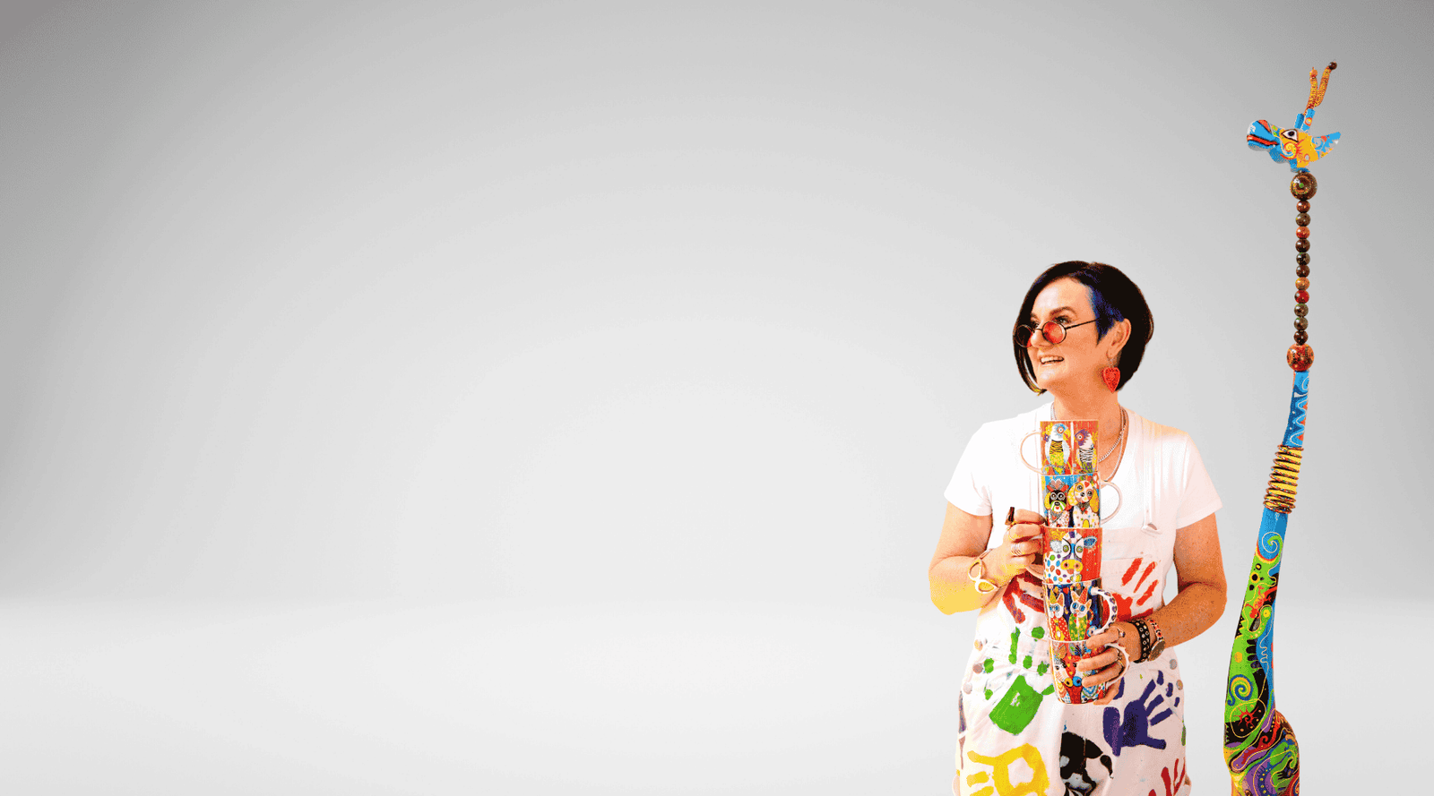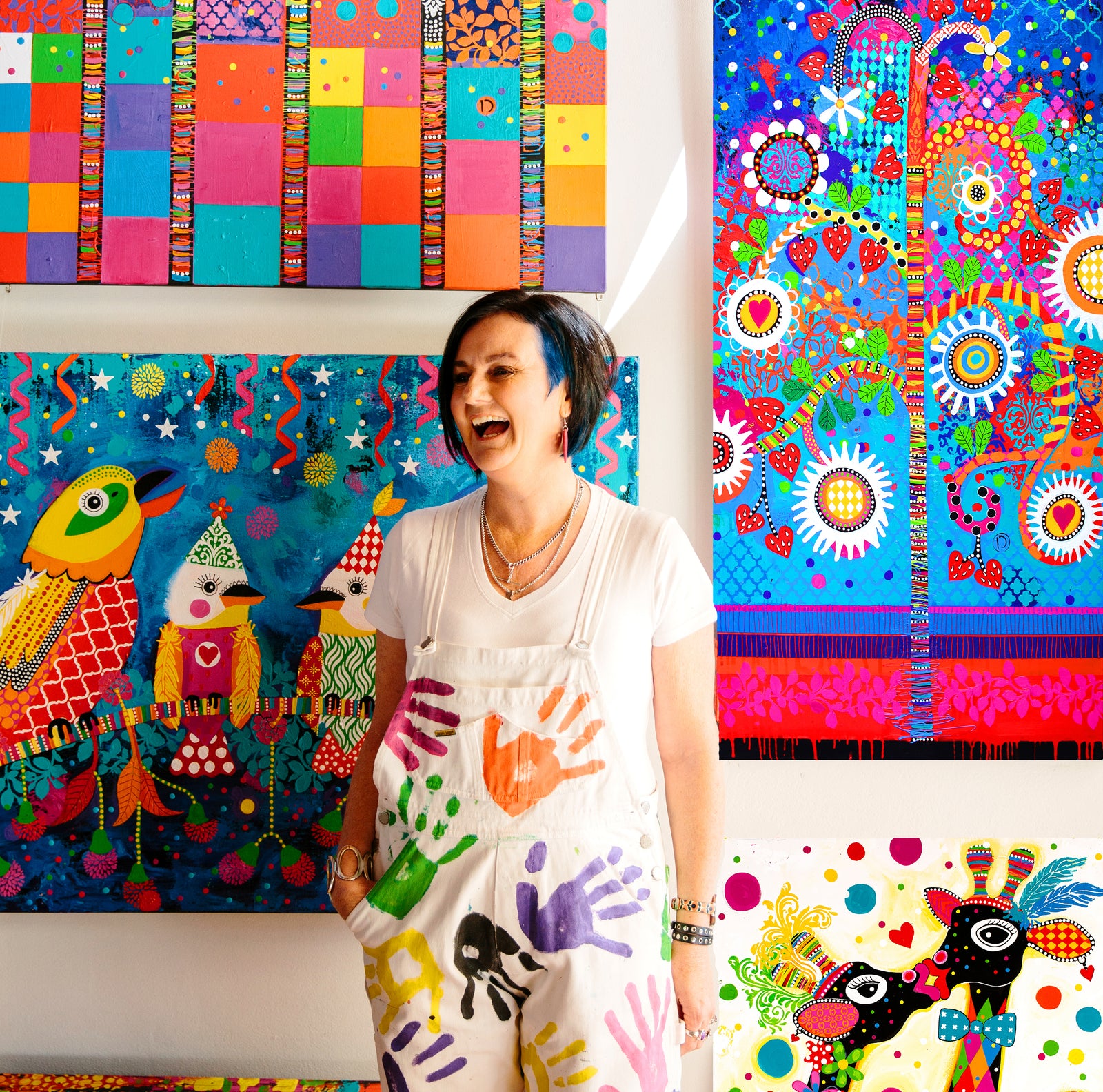 Each original painting is infused with bold imagination, love of colour, and a zest for life that shines through.