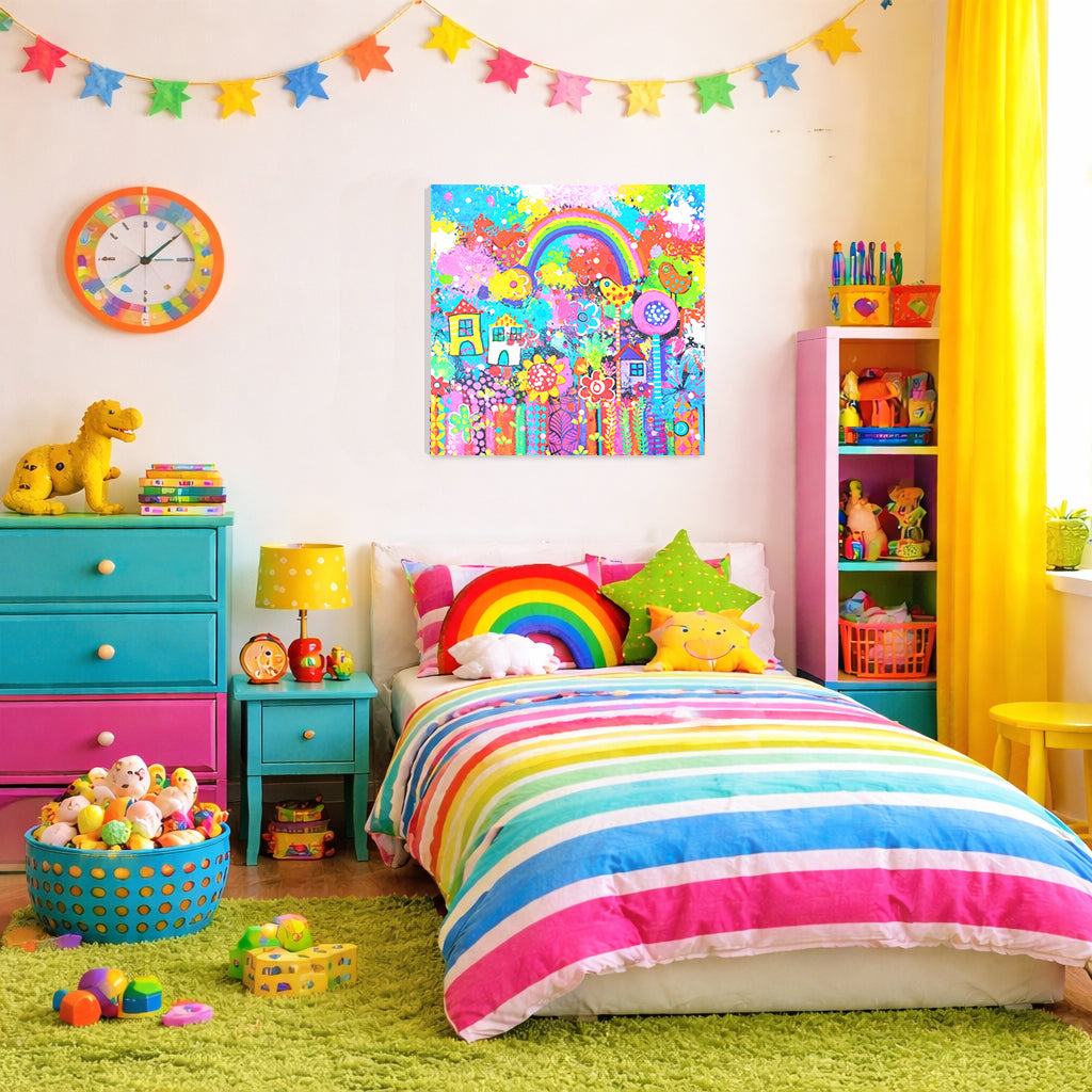 The first painting of the year, Colourburst Grove is a joyful explosion of colour and imagination. Playful houses, cheerful birds, blooming flowers and a radiant rainbow come together in a whimsical landscape that celebrates creativity, optimism and the magic of new beginnings.