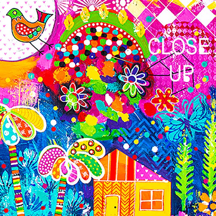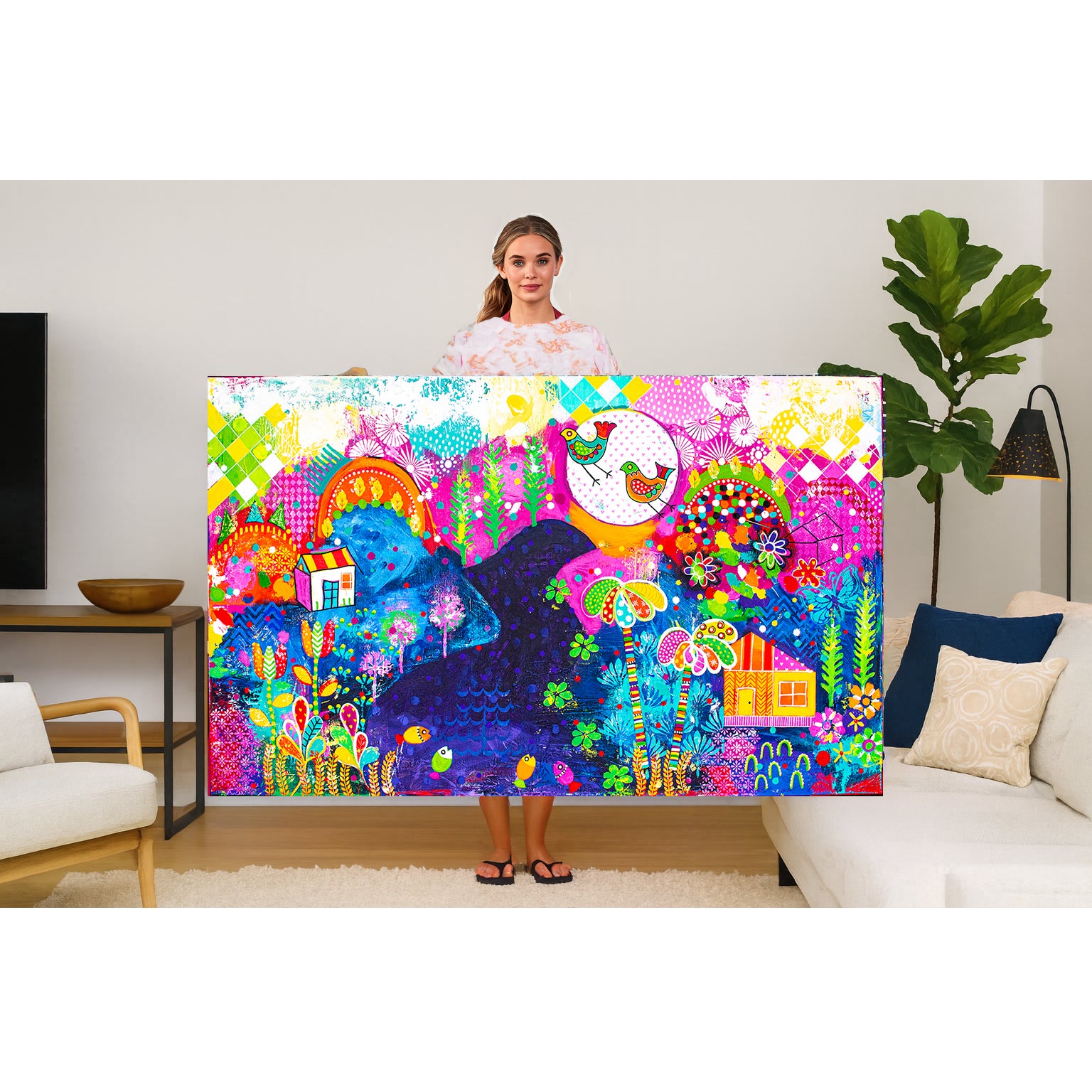 This painting represents Donna's life - a joyful celebration of colour and imagination. Bursting with vibrant patterns, playful shapes, and whimsical details, it captures a dreamlike world dancing under a magical moon. The bold palette radiates happiness and a sense of wonder, celebrating the beauty of life in full colour.